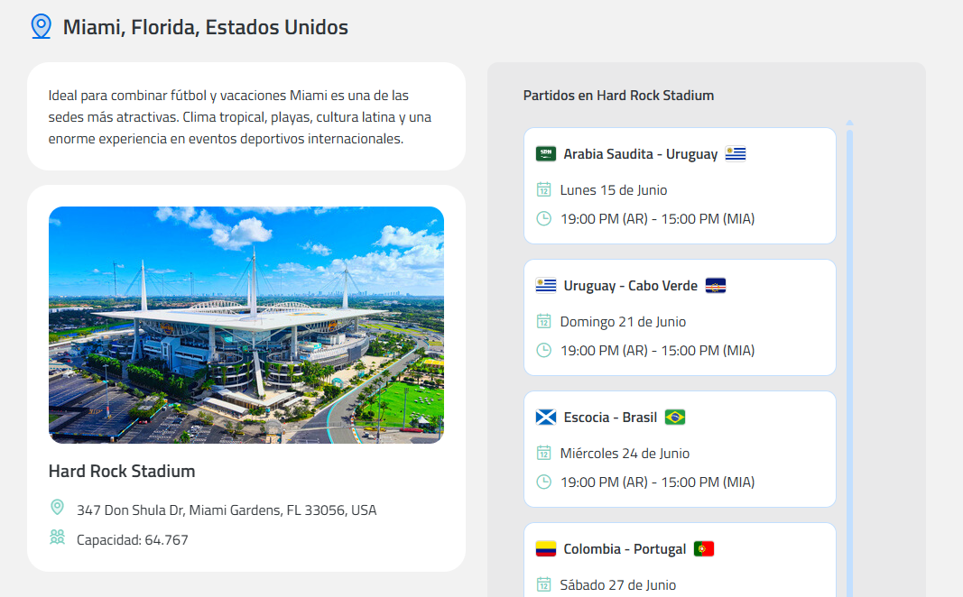 - Itinerario automático: Al elegir a tu equipo (ej. Argentina, México, Colombia), la guía te despliega automáticamente su calendario de fase de grupos: fechas, horarios (en tu hora local y la de la sede) y estadios.