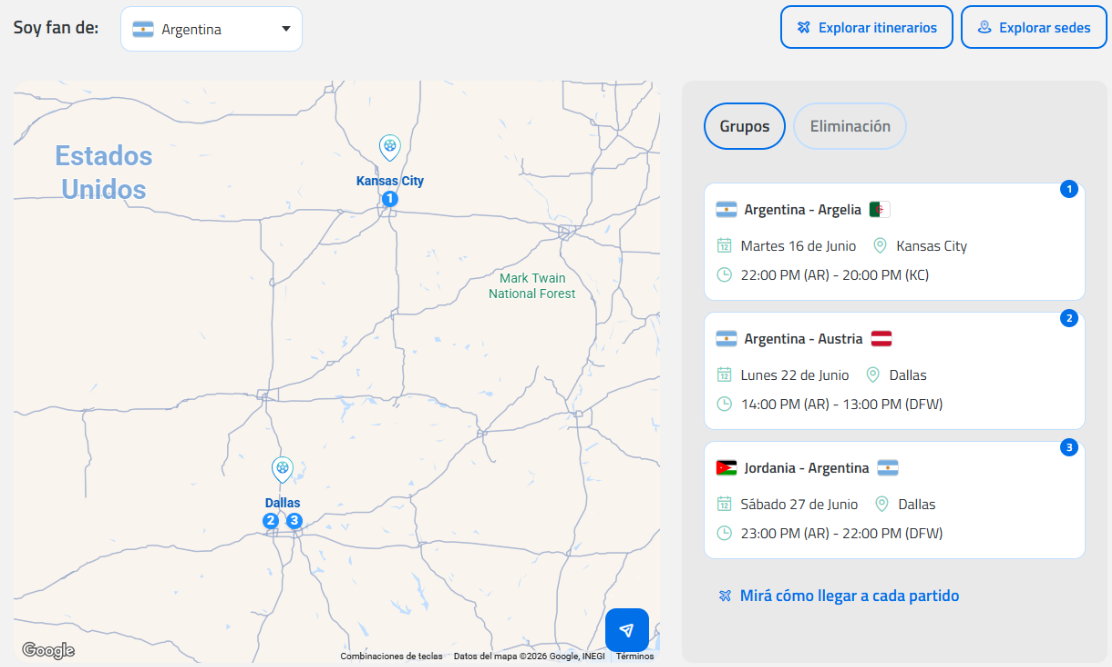 - Ejemplo Argentina (Grupo J): Tu base será la zona central (Kansas City), lo que implica vuelos internos constantes si quieres ver todos los partidos de grupo.